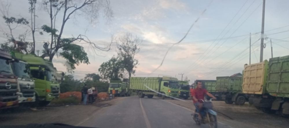 Ratusan Dam Truk yang pakir di Bahu beram badan jalan Yang Mengakibatkan Terganggunya Pengguna Jalan, akibat dari antrian Panjang muatan batu bara di stok tumpukan milik Perusahaan PT Hotama kuado..