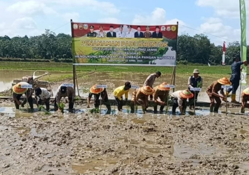 Halo Jambi Sarolangun - Pemerintah kabupaten sarolangun bersama kelompok tani selang rengas di pulau pinang kelurahan sarolangun kembang kecamatan sarolangun, melaksanakan penanaman padi serentak se-provinsi jambi. Selasa (22/04/25)