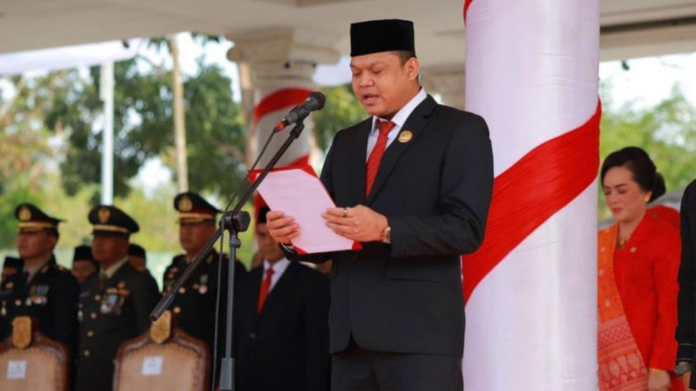 MUARO JAMBI,HALOJAMBI.ID-Yuli Setia Bakti Ketua DPRD Muaro Jambi bertugas membaca teks Proklamasi